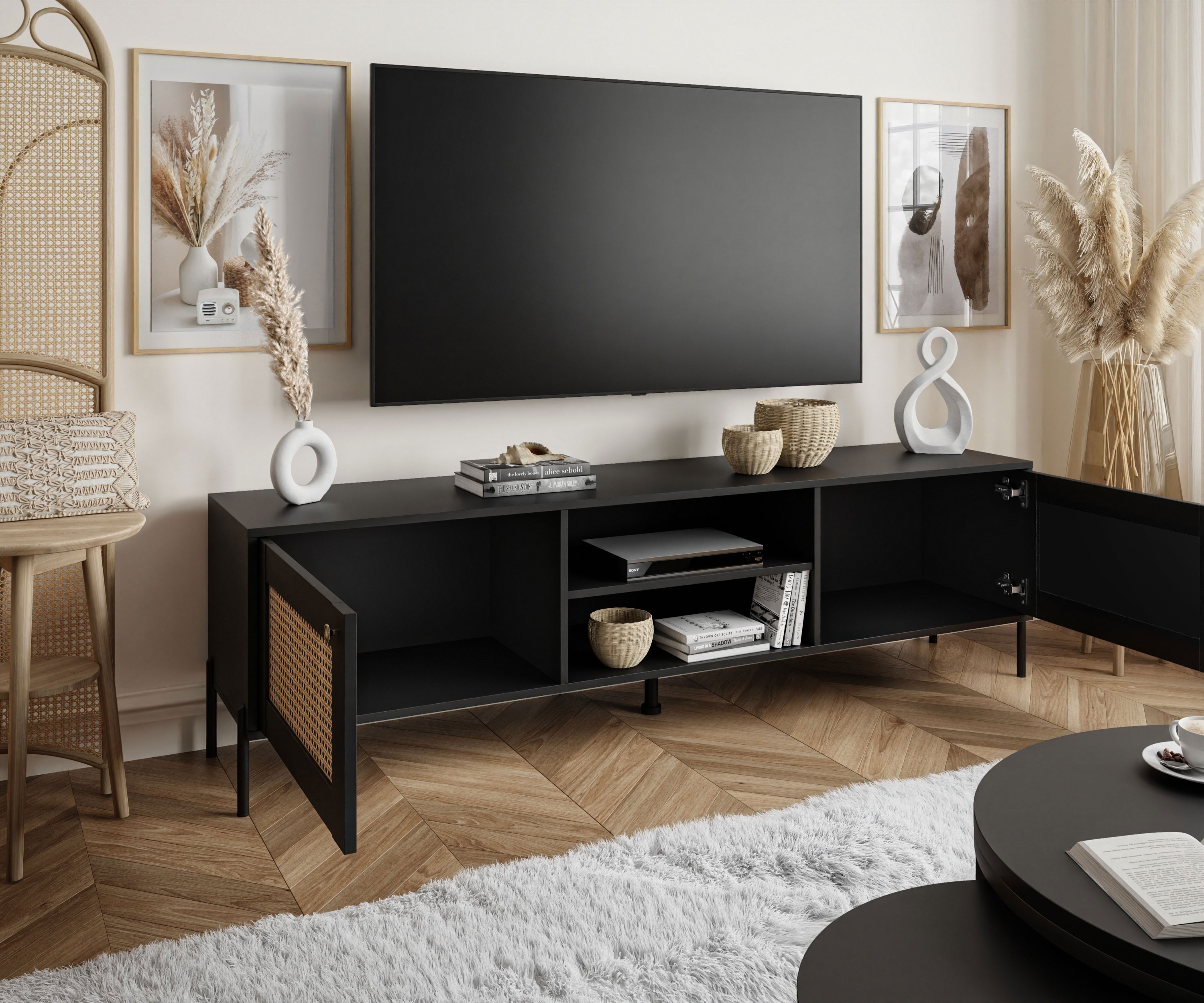 Der TV-Schrank VIENNA zeichnet sich durch seine sorgfältige Gestaltung und sein minimalistisches Design aus. Der klassische dunkle Korpus wird mit den originalen naturfarbenen Schilfrohrfronten kombiniert und bildet so ein perfekt harmonisches und ausdrucksstarkes Duo. Die Möbel zeichnen sich durch ihr faszinierendes Boho-Styling und ihre Funktionalität aus, die in jedem Wohnzimmer unverzichtbar ist. Der TV-Schrank verfügt über eine durch einen Einlegeboden unterteilte Nische, in der Audiogeräte oder eine Set-Top-Box untergebracht werden können, und einen Raum hinter der Tür, in dem größere Gegenstände untergebracht werden können.