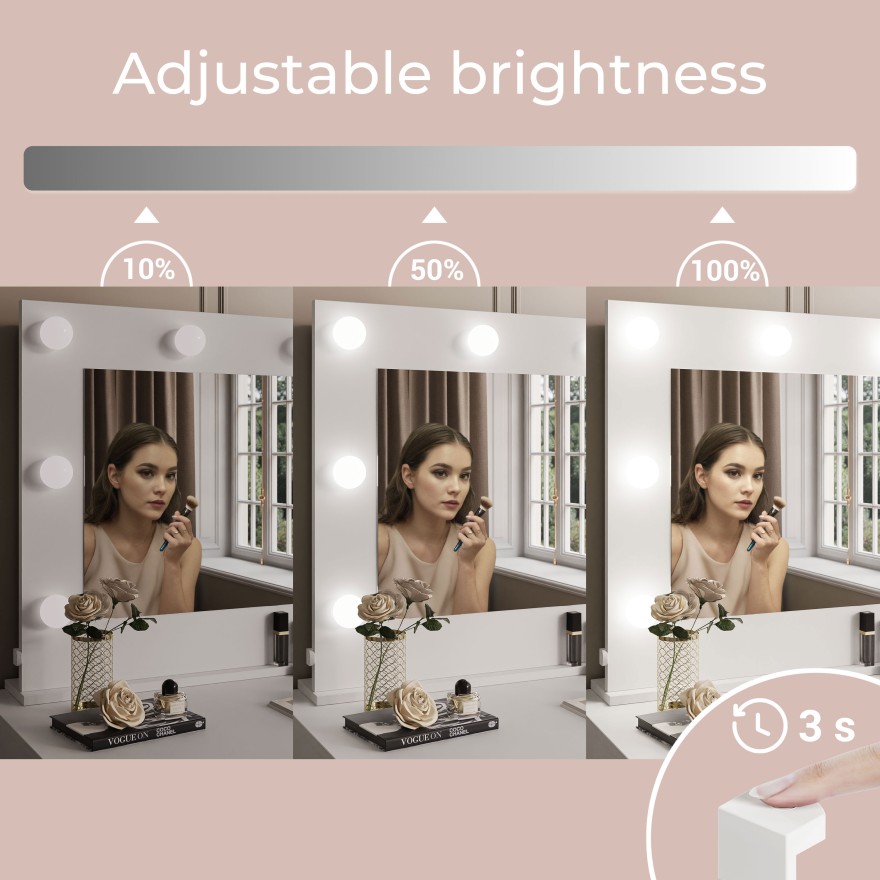 Der äußerst charmante Spiegel MADA ist eine tolle Dekoration für Ihr Schlafzimmer oder Badezimmer. Der große Spiegel mit 9 farbneutralen Glühbirnen lässt Ihr Gesicht wunderschön erstrahlen und ermöglicht es Ihnen, das perfekte Make-up vorzubereiten.