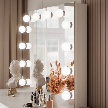 Bemerkenswert ist, dass der Schminktisch Aurora mit einem großen Spiegel ausgestattet ist, der von einer Girlande aus zwölf eleganten LED-Lampen umgeben ist. Ihre symmetrische Anordnung garantiert eine perfekte Ausleuchtung, die es Ihnen ermöglicht, Ihr Make-up auf höchstem Niveau aufzutragen.