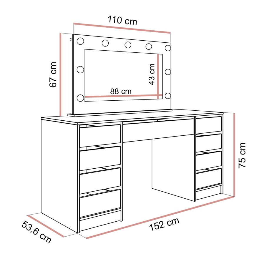 Das zentrale Element des Schminktisches ist ein großer Spiegel mit effektvoller LED-Beleuchtung in Form von 12 Glühbirnen, die rund um die Spiegelfläche angeordnet sind. Sie sorgen für ein ideales, gleichmäßiges Licht, wodurch tägliches Make-up und Pflege noch komfortabler und präziser werden. Die sanfte Beleuchtung schafft zudem eine besondere Atmosphäre – perfekt für Momente der Entspannung und Selbstpflege.