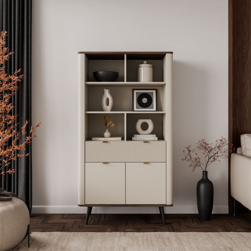 Das Regal AUTUMN kombiniert elegante Kaschmirfronten mit einer praktischen Anordnung von Regalen, Schubladen und verschließbaren Türen. Dezente Details und geriffelte Akzente verleihen dem Innenraum einen modernen, stilvollen Charakter.