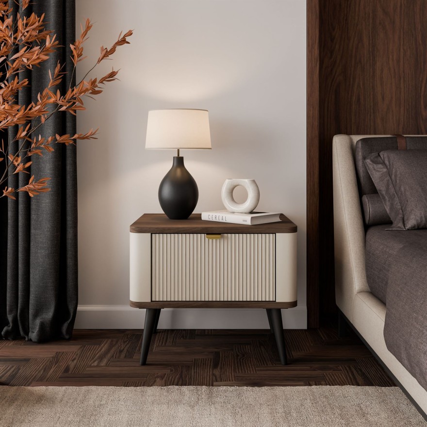 Der Nachttisch AUTUMN verbindet elegantes Design mit praktischer Form. Mit seiner geräumigen Schublade und den Metallfüßen passt er perfekt in ein modernes Schlafzimmer.