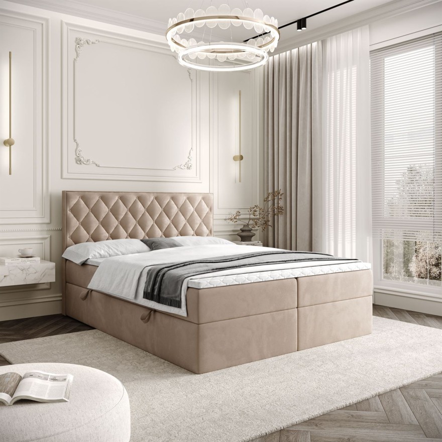 Zentrales Element des Bettes ist ein eindrucksvoller, dekorativer Kopfteil, verziert mit Steppnähten in Form subtiler Rauten. Er verleiht dem gesamten Design einen außergewöhnlich stilvollen Charakter und setzt zugleich einen eleganten Akzent in der Schlafzimmergestaltung. Die glatte Front des Bettes bewahrt einen minimalistischen Look, wodurch sich dieses Modell sowohl in klassischen als auch in modernen Interieurs perfekt einfügt. Eine breite Auswahl an verfügbaren Stoffen und Farben ermöglicht es, das Bett mühelos an individuelle Vorlieben und den Stil des Raumes anzupassen.