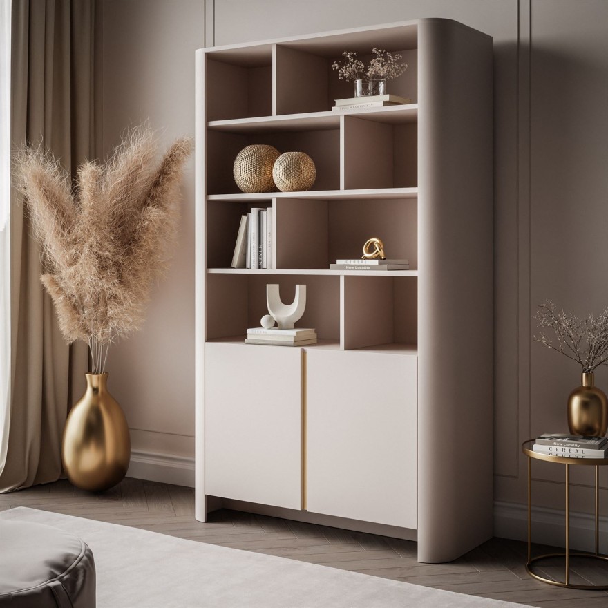 Der zarte kaschmirfarbene Ton vermittelt im Raum Leichtigkeit und Wärme und unterstreicht gleichzeitig den minimalistischen Charakter des Möbels. Die matten Fronten verleihen dem Regal eine elegante, zeitlose Form, die sowohl in modernen als auch in eher klassischen Räumen perfekt zur Geltung kommt. Klare Linien und sorgfältig abgestimmte Proportionen sorgen dafür, dass die Form harmonisch und ästhetisch wirkt, ohne den Raum zu dominieren.