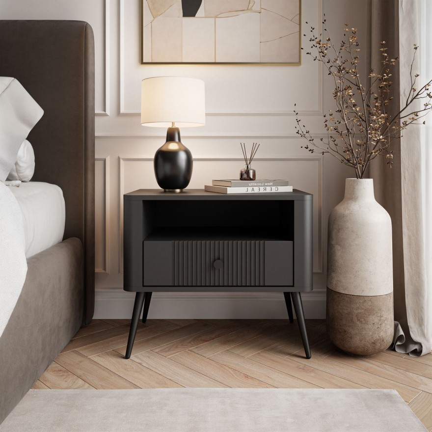 Das Modell ist mit einer geräumigen Schublade ausgestattet, die eine komfortable Aufbewahrung der wichtigsten Gegenstände – Bücher, Dokumente oder Nachtaccessoires – ermöglicht. Das offene Fach über der Schublade bietet zusätzlichen Platz für Dekorationen, eine Nachttischlampe oder Dinge, die stets griffbereit sein sollen. Die durchdachte Aufteilung sorgt für Ordnung und setzt gleichzeitig das stilvolle Design des Möbels in Szene.