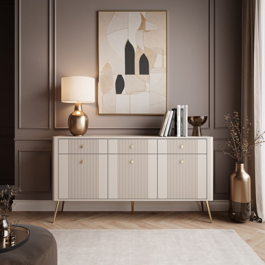 Die Kommode ELYSIA KASCHMIR vereint moderne Eleganz mit praktischem Design – drei geräumige Schubladen sowie drei geschlossene Schränke ermöglichen eine komfortable Organisation aller Gegenstände. Die geriffelten Fronten und die Metallfüße verleihen dem Möbelstück Leichtigkeit und unterstreichen seinen subtilen Stil sowie seinen modernen Charakter.