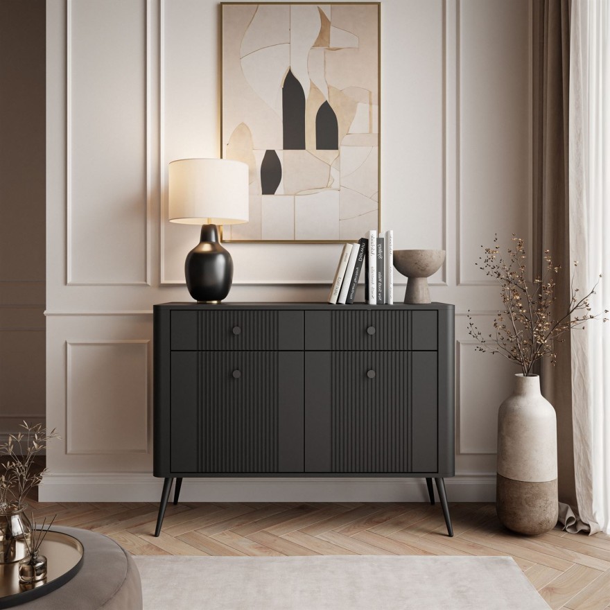 Die geriffelten Fronten verleihen der Kommode eine besondere Ausstrahlung, indem sie das Licht dezent reflektieren und einen Effekt von Tiefe und eleganter Struktur erzeugen. Metallgriffe sowie sorgfältig ausgearbeitete Details schaffen eine stimmige, moderne Komposition, die perfekt zu Einrichtungen im Stil Modern Classic oder Loft passt.