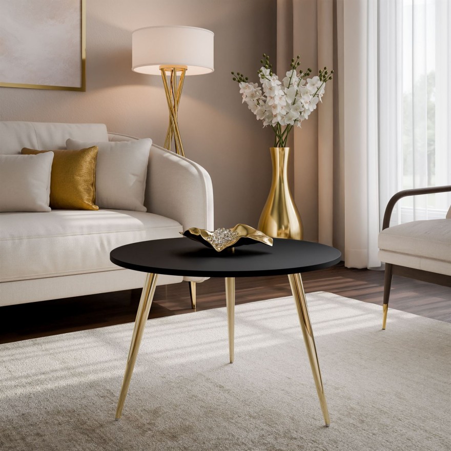 Runder Couchtisch SOLEIL II, mattschwarz, auf goldenen Beinen