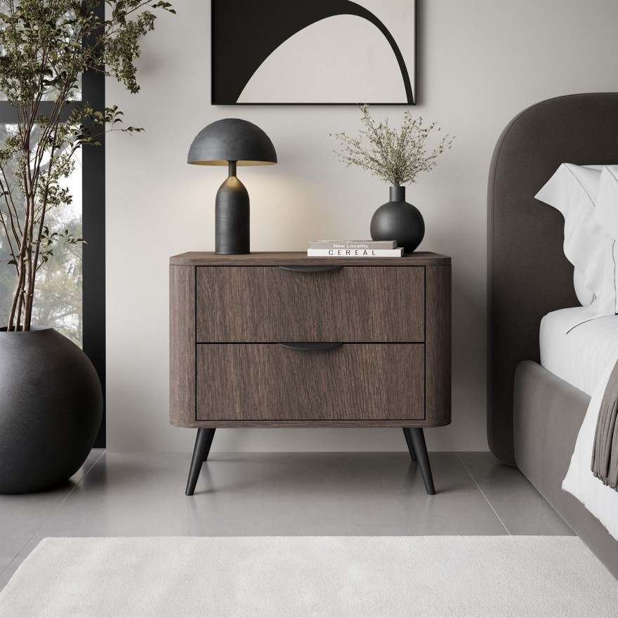 Der Nachttisch TWILIGHT mit zwei Schubladen ist ein modernes Schlafzimmermöbel, das elegantes Design mit praktischer Aufbewahrung verbindet. Die geriffelten Fronten und die schlanken Metallbeine machen ihn zur idealen Wahl für Loft, Minimal- und moderne Einrichtungsstile.