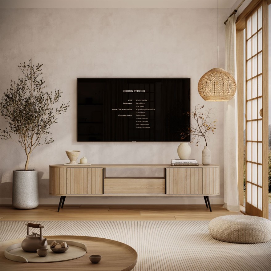 Der TV-Schrank WILLOW ist eine elegante Kombination aus geriffelten Schiebetüren und einer abgerundeten Form in einem hellen Cremona-Eichenfarbton. Dank seiner hohen Funktionalität und seines modernen Designs im Japandi-Stil ist er die ideale, stilvolle Ergänzung für Ihren Multimedia-Bereich.