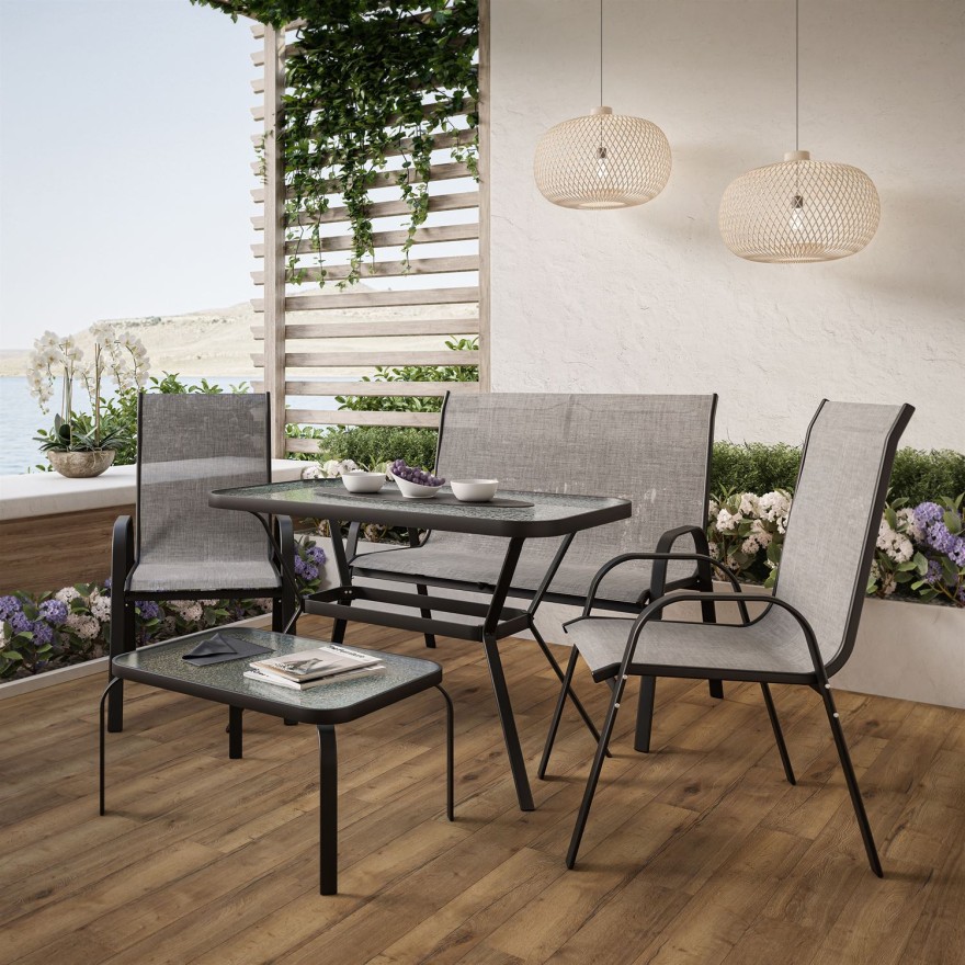 Die Konstruktion des Sets besteht aus robustem Stahl, was Stabilität und Langlebigkeit gewährleistet. Zudem können Sie dank der Mobilität der einzelnen Elemente die Möbel selbst anordnen und je nach Bedarf umstellen.