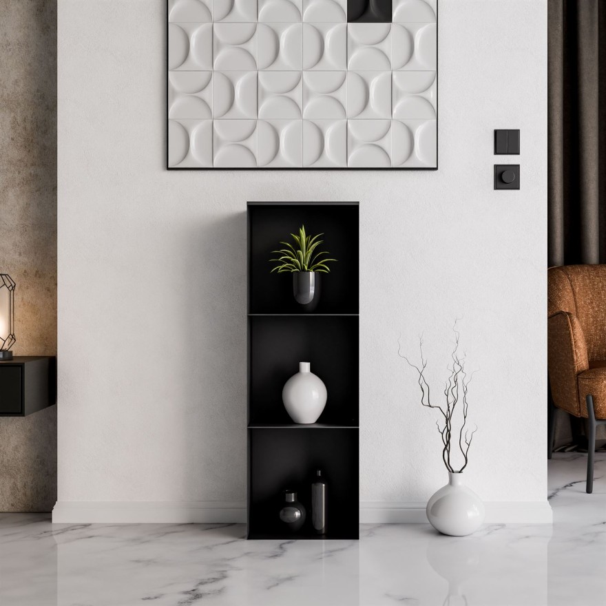 QUADRO in vertikaler Anordnung ist eine moderne Komposition aus drei Metallregalen, die minimalistisches Design mit einer eleganten Präsentationsform verbindet. Die solide Verarbeitung und die optionalen LEDs machen das Ganze zu einem stilvollen, harmonischen Blickfang im Raum.